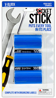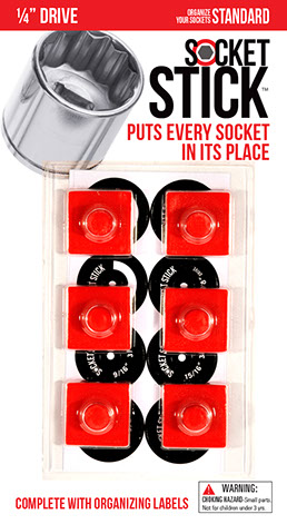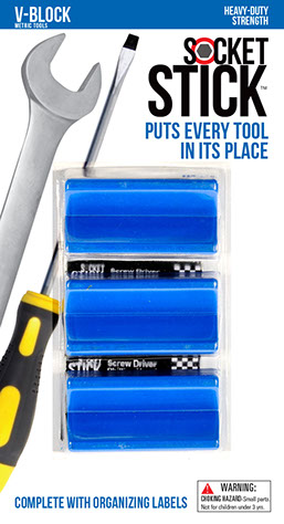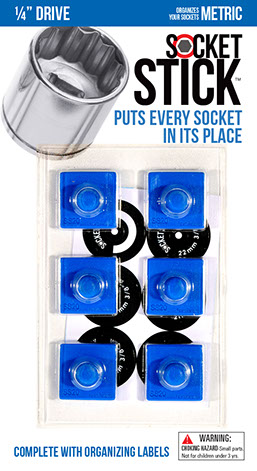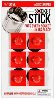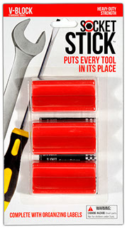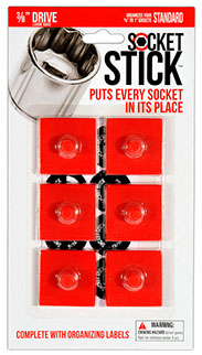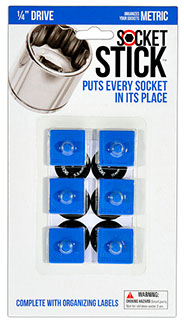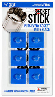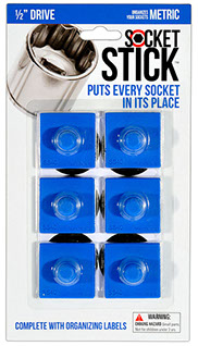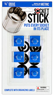 It is the newest thing in the world of tools. You use it to organize your sockets so you know where to find them, where to return them and most importantly, when they are missing.   It comes in the 3 most common sizes for socket drives – 1/4”, 3/8” and 1/2".   It comes with labels so you can identify which socket belongs on which SocketStick.  Underneath, it has a rare earth, nyodium magnet which holds the Socket to the SocketStick and the SocketStick to any steel surface like a drawer in your toolbox or the inside of a metal cabinet door.   It also comes in Red for Standard sockets and Blue for Metric sockets.